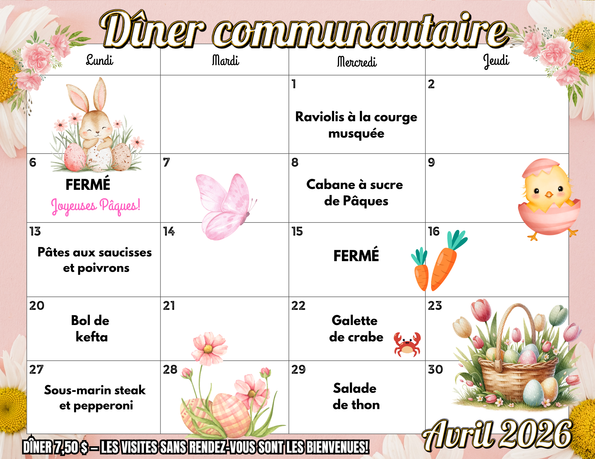 Les lundis et mercredis de 12 h à 13 h, joignez-vous à nous dans la salle à manger pour un dîner communautaire maison de trois services. Le repas comprend une soupe ou une salade, un plat principal, un dessert ou un fruit, ainsi qu’un café.
