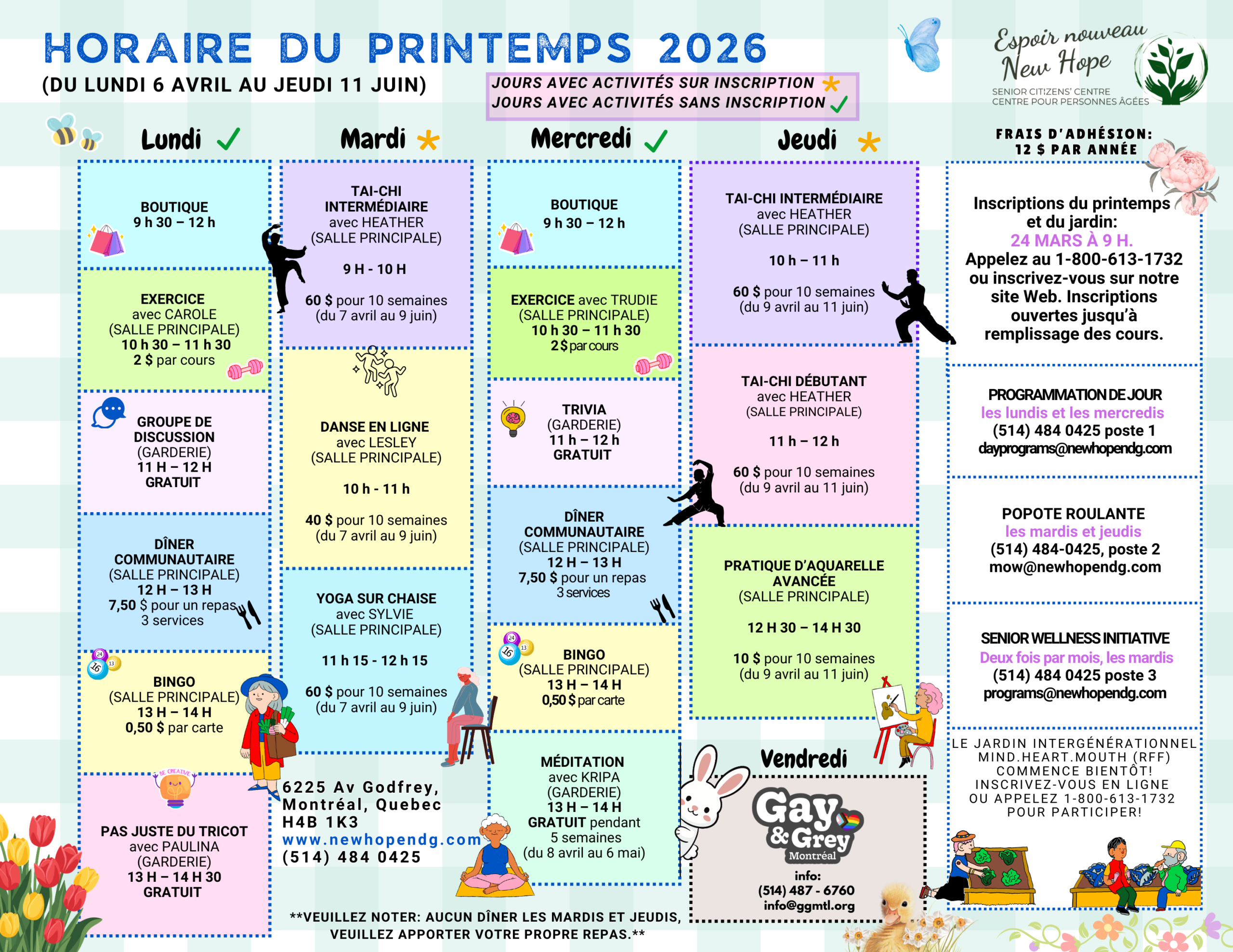 L’inscription aux activités des mardis et jeudis – Session du printemps – ouvrira le 24 mars à 9 h. La session débutera le 7 avril et se terminera le 11 juin.