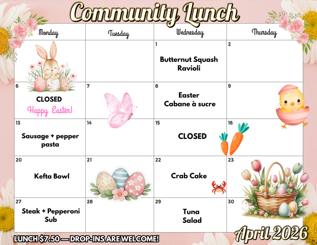 On Mondays and Wednesdays from 12:00 to 1:00 PM, join us in the dining room for a homemade three-course community lunch.