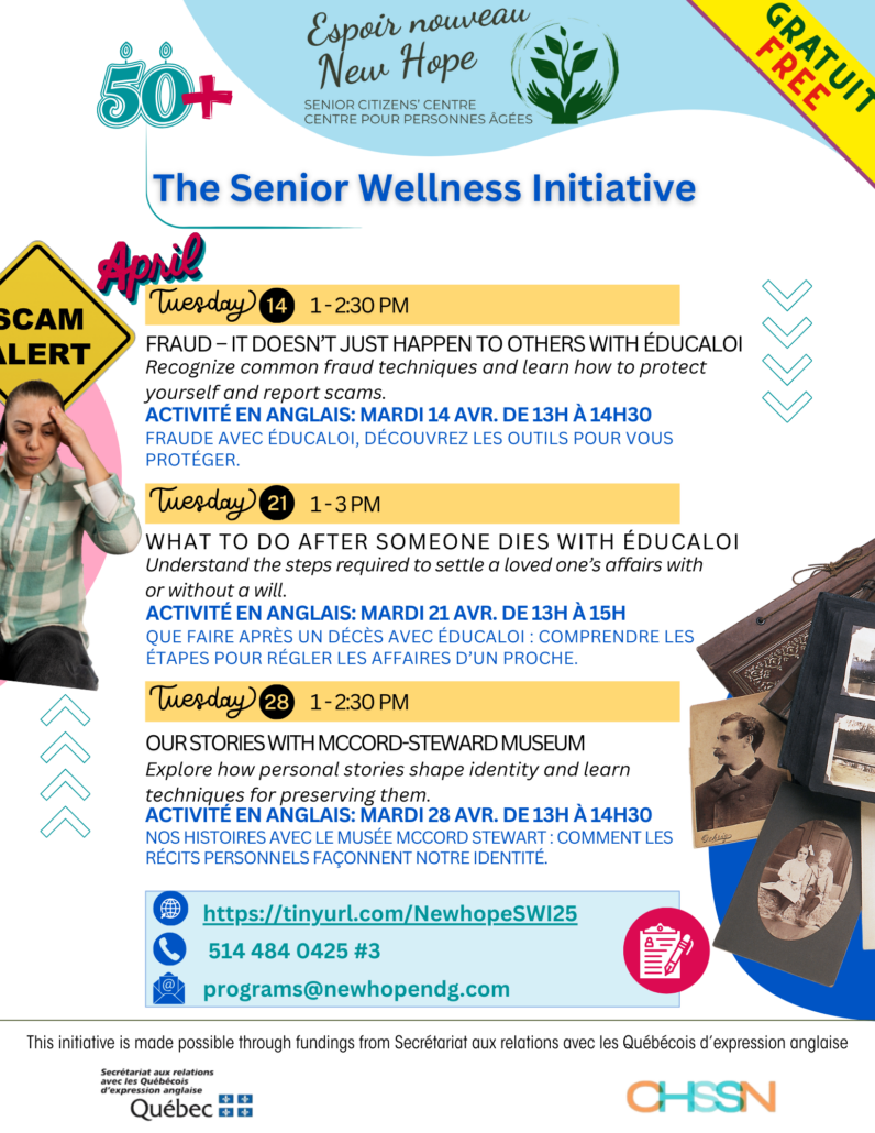 The Senior Wellness Initiative is funded by the CHSSN and the Secrétariat aux relations avec les Québécois d’expression anglaise.